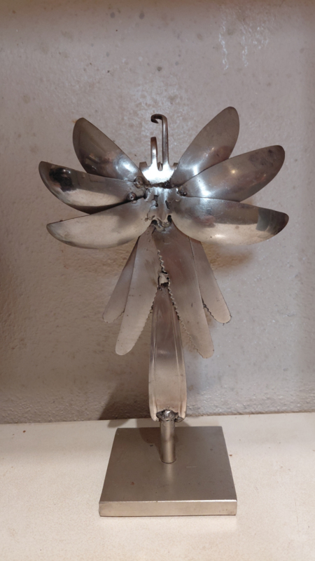 Voor het maken van deze creatie is er gebruik gemaakt van een oud bestek en wat rest materiaal dat afkomstig is van de oud ijzerhandel.