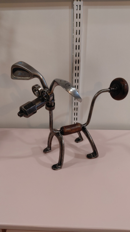 Hond gemaakt van oude houtboor en hoefijzers. Deze creatie is gemaakt in onze eigen werkplaats waar duurzaamheid centraal staan afm +/- 40x15cm.