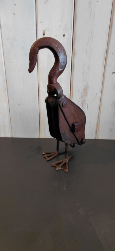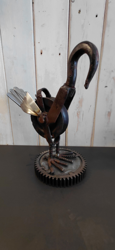 Vogel gemaakt van oude katrol en oud bestek
