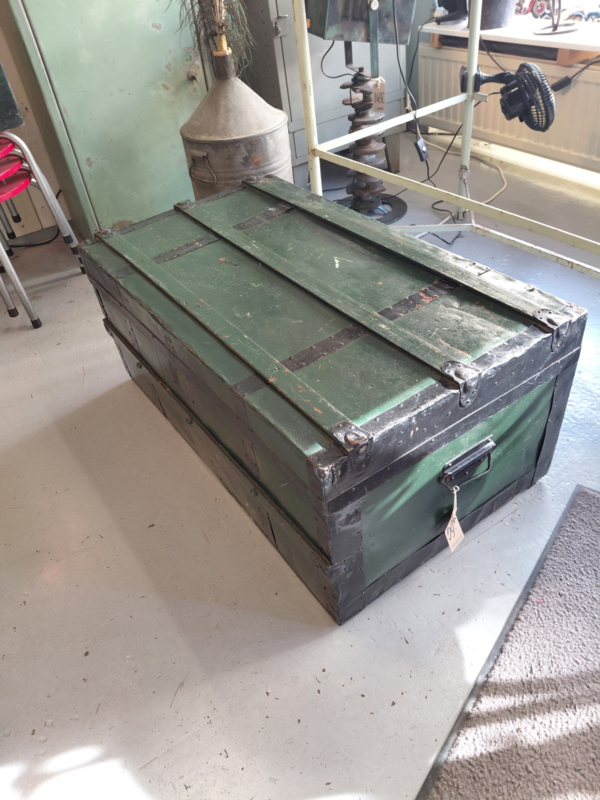 Oude brocante dekenkist / hutkoffer / scheepskoffer. Deze grote oude kist is ideaal als extra opbergruimte en leuk als decoratie! Met zijn groene kleur en houten verstevigings latten aan de buitenzijde die geven de kist een…